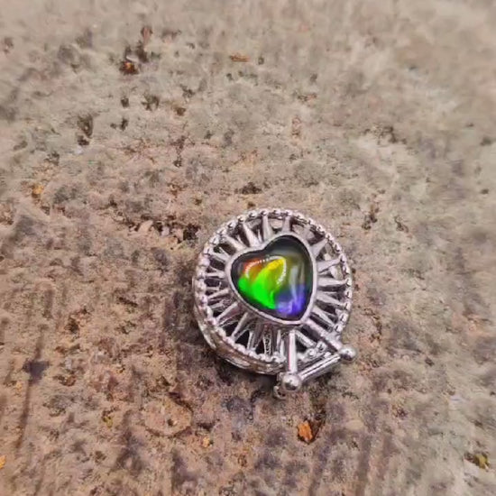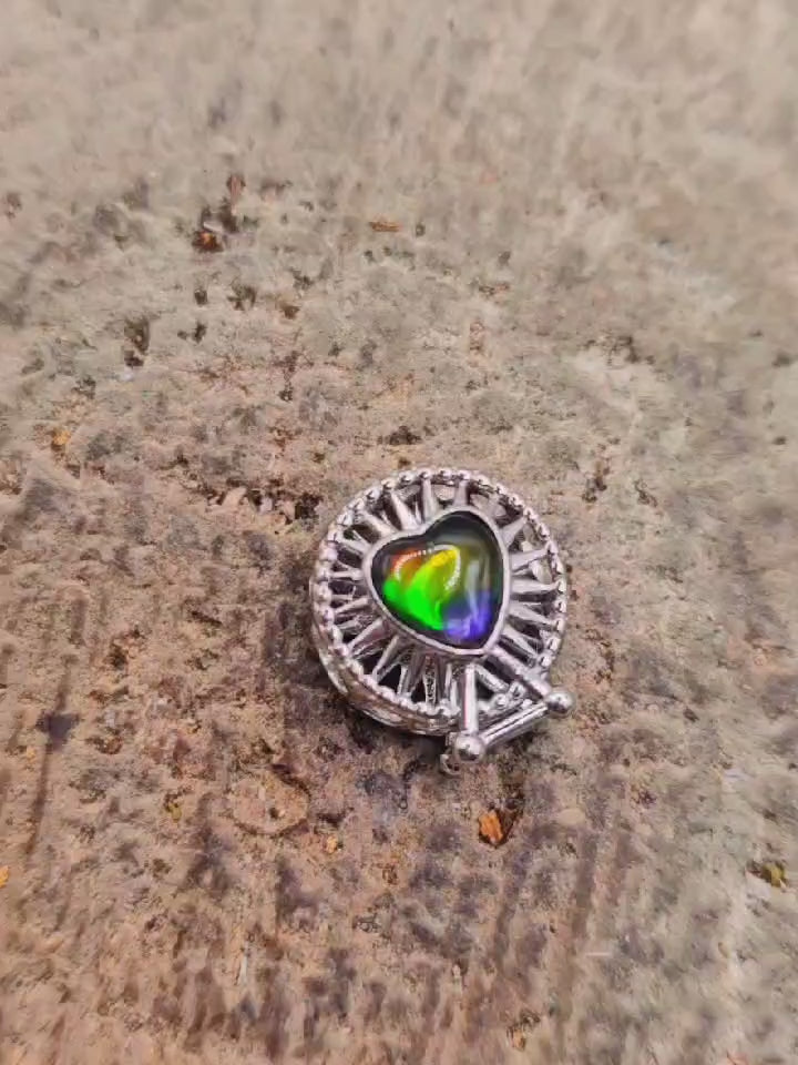 This stunning pendant features a genuine Canadian ammolite with vibrant rainbow flash—purple, green, yellow, blue, red, and orange—each angle reveals a different spectrum of light. Set in a whimsical Ferris Wheel design, the pendant includes a heart-shaped cutout that beautifully frames the gemstone. The pendant is uniquely designed to stand upright on its own, making it a charming decorative accent when not worn. The back features carving of tarry sky , while the sides with additional heart-shaped cutouts.