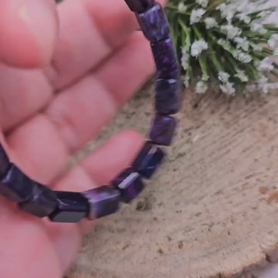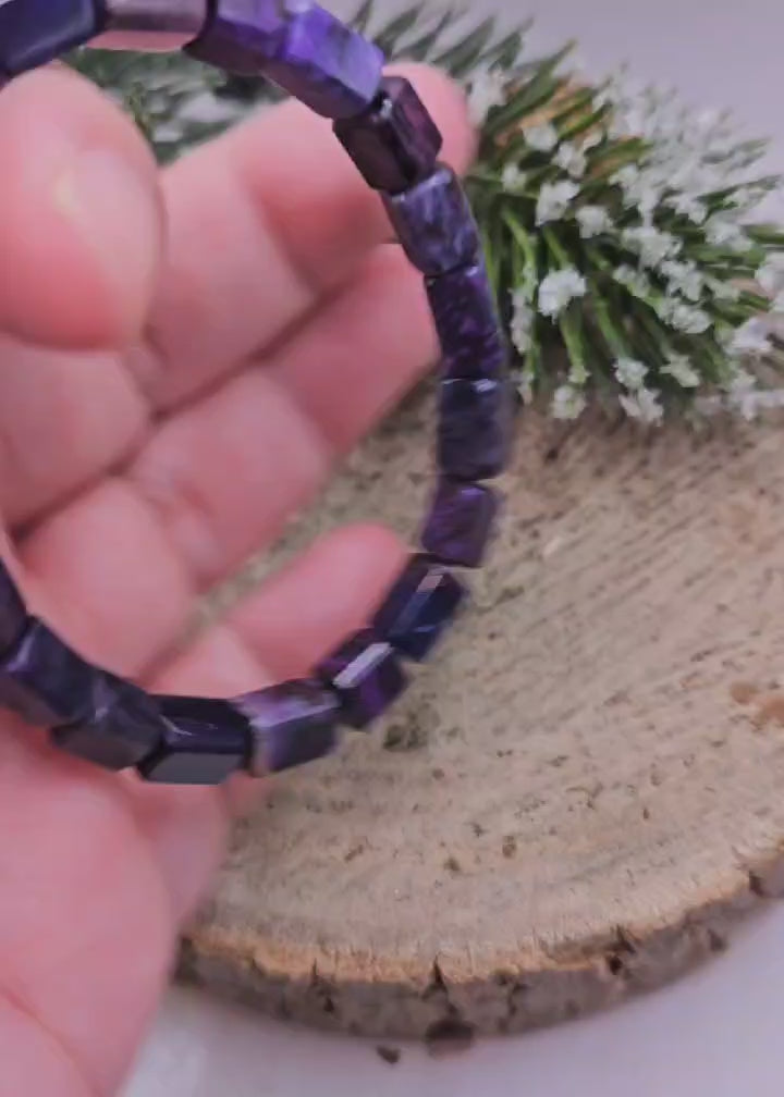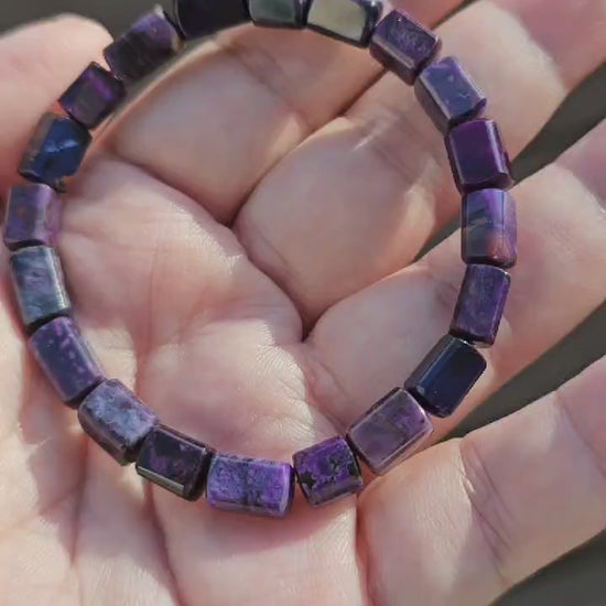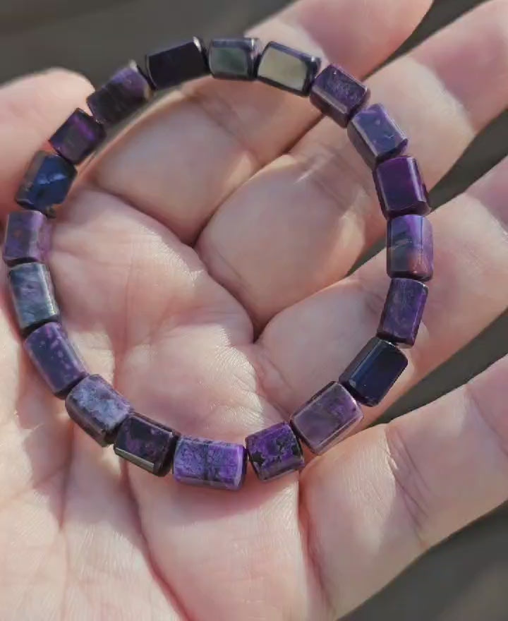 This bracelet features 20 pieces of genuine, untreated sugilite in rare rectangular cube beads—each one naturally formed and uniquely patterned. The stones display a range of hues, from deep violet to soft blue, with marbled textures that highlight the true beauty of sugilite.