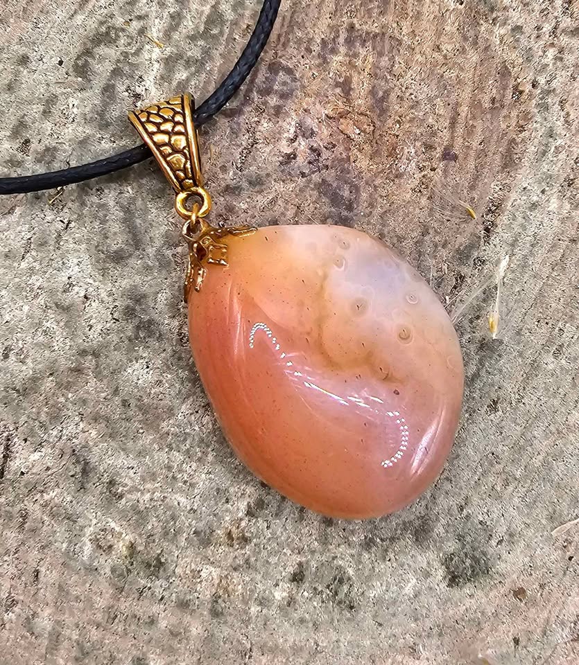 This pendant figures a big noticeable size nature agate with noticeable druzy at the top. The color is light peach brown, you will also notice some banded agate pattern. The bail has artisan pattern in gold tone. This pendant is very attention catching.