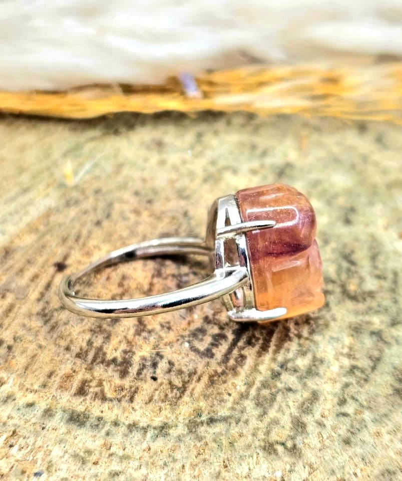 The ring features a pixiu design carved with nature rainbow fluorite. You could see its beautiful transition of colors. The pixiu is big and noticeable. It is adjustable in size. Please text me for any questions