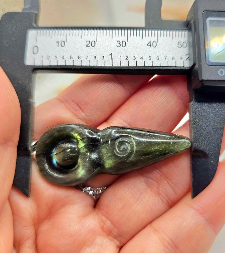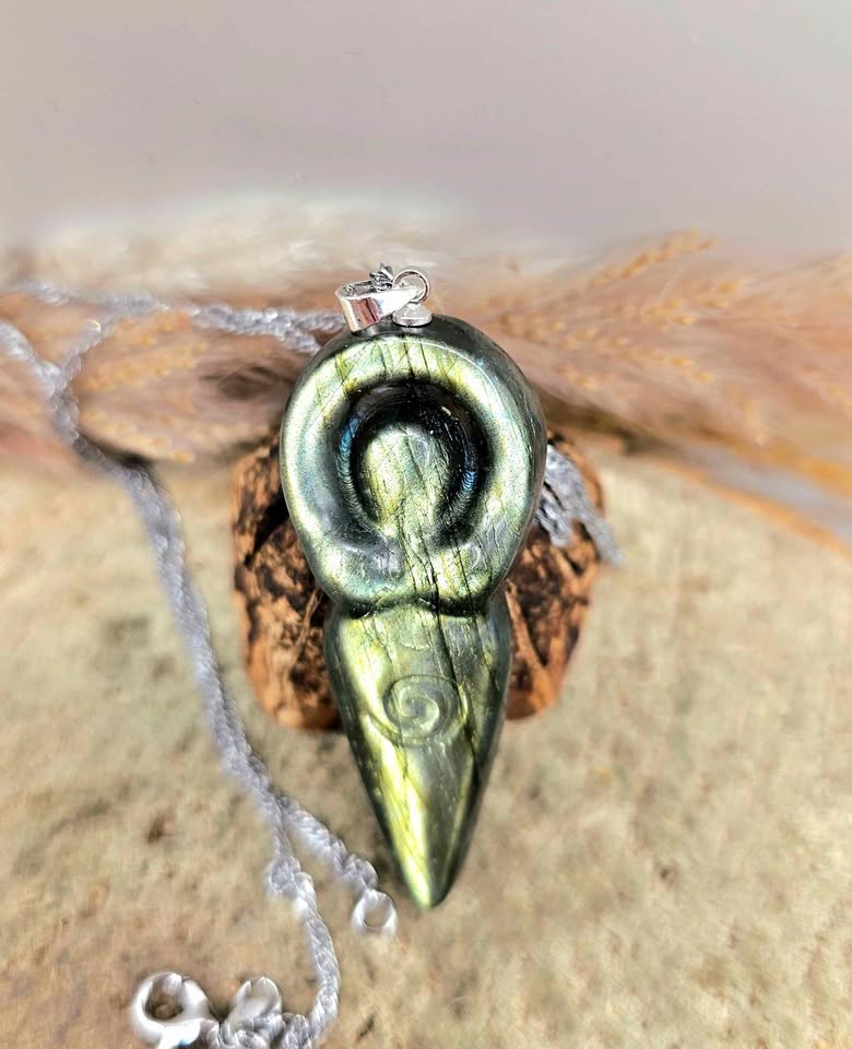 This pendant features a carving of spiral goddess, it is carved with nature labradorite with beautiful strong flash. Spiral Goddess represents the Divine Feminine, fertility, and the eternal cycle of life, death, and rebirth. You will see a female figure ,arms raised with a spiral located on her belly or womb.