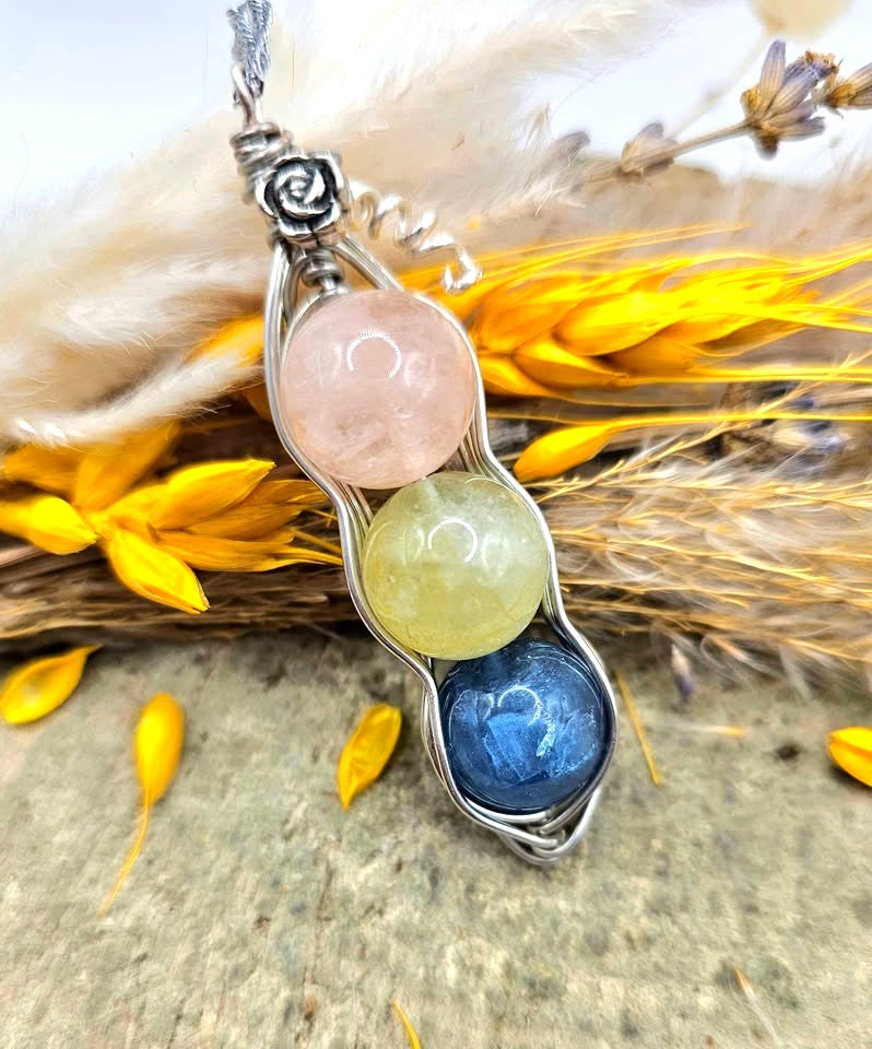 This pendant features three large natural morganite round beads in pink, yellow, and blue, creating a beautiful and eye‑catching color contrast. Each bead is carefully set within a handcrafted wire‑wrapped peapod design, showing layered wrapping along the sides. The piece is finished with a flower accent and a curled wire leaf at the top Both the beads and the pendant itself are generously sized and very noticeable