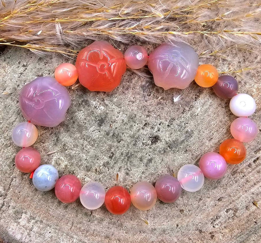 This Nature Yanyuan Agate Lotus Bracelet features beautifully translucent, candy‑colored natural Yanyuan agate beads, Each bead is very translucent. There are 3 big lotus beads at the center.