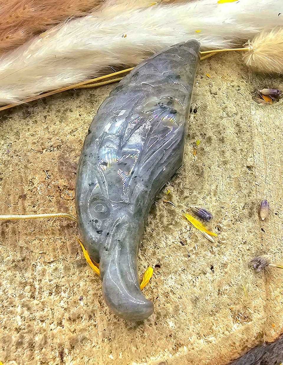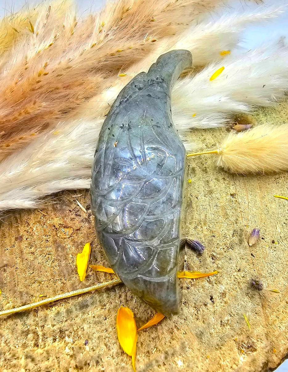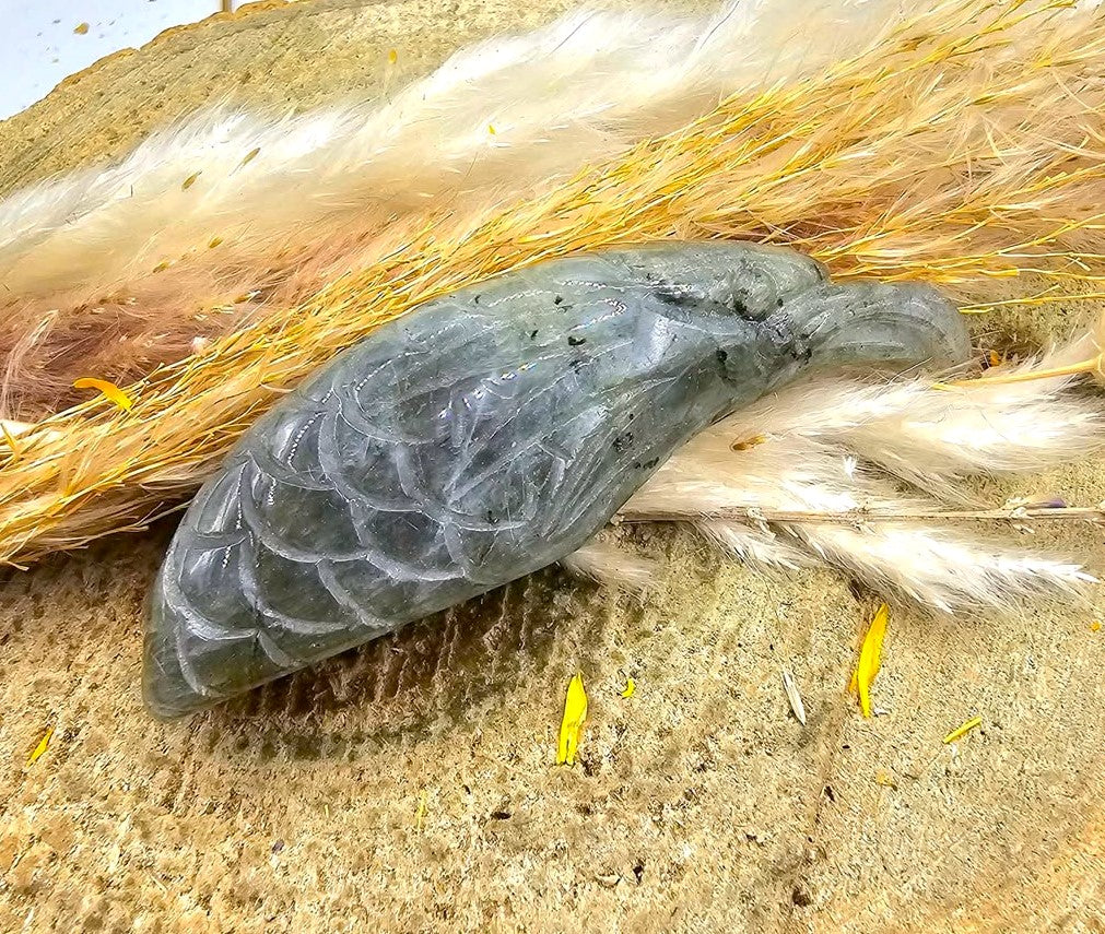 This figure features a design of an eagle head carved with nature labradorite with beautiful flash. You could see the details for the feather texture, strong peak and powerful expression. It has a flat base that could stand well to display